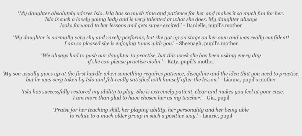 Please get in touch if you are interested in violin or fiddle lessons with Isla.